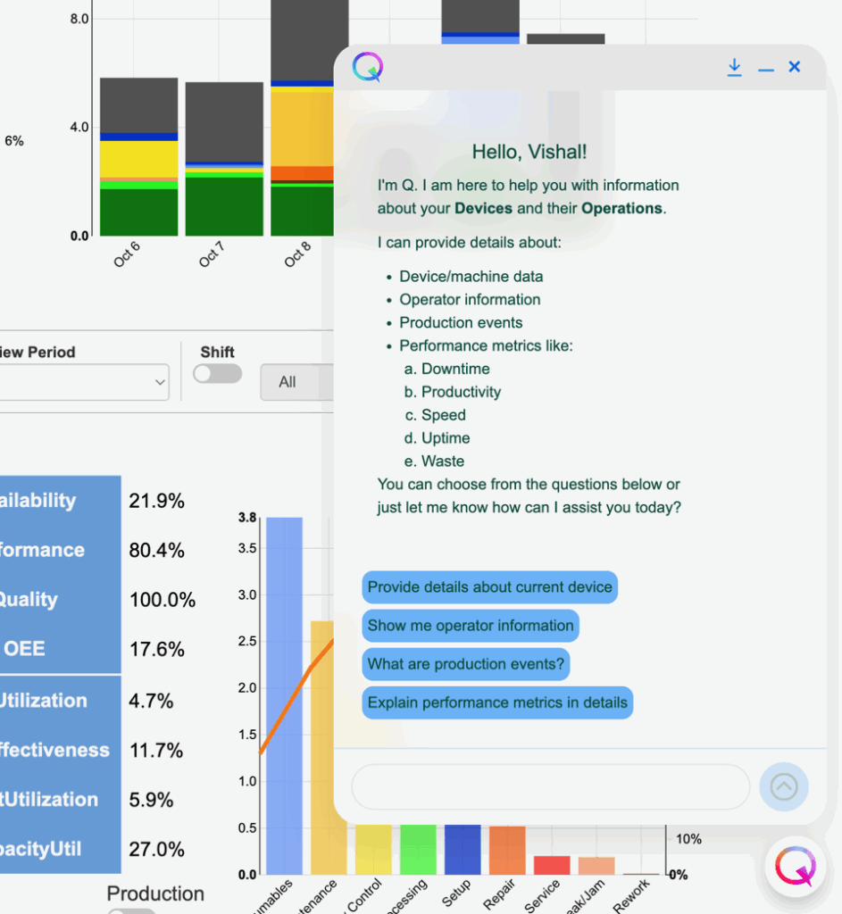 Ask and Receive: Simply type your question in natural language – “Which operator had the highest efficiency last month?” or “What caused the downtime on Press 3 last week?” – and get immediate, accurate answers.
